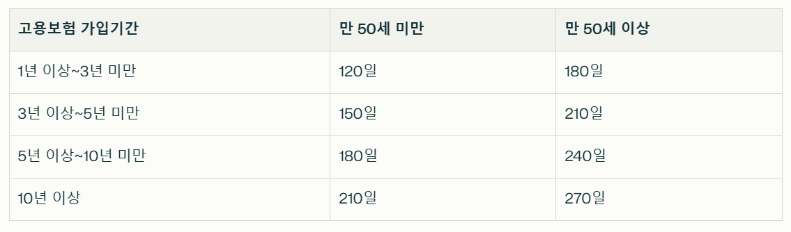 퇴직 당시의 연령과 고용보호보장 가입기간에 따라 최소 120일에서 최대 270일까지 수급 가능합니다.