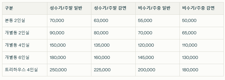 - 숙박자 주차 1대 무료 (6인실은 2대)