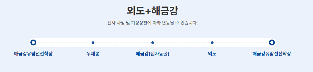 1. 태풍, 너울성 파도 등 해상 기상 악화 시 유람선 운항이 중지되거나 외도 접안이 불가할 수 있습니다.