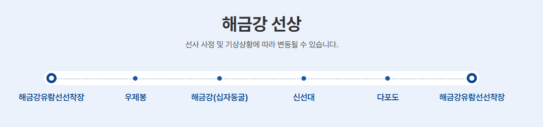 2. 승선 장소: 경상남도 거제시 남부면 해금강로 270 해금강유람선 선착장. 출항 시간과 편수는 요일·성수기·기상에 따라 달라집니다.