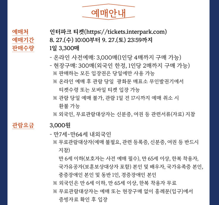 1. 예매는 빠르게: 매일 3,000매 한정이라 오픈과 동시에 매진되는 경우가 많습니다.