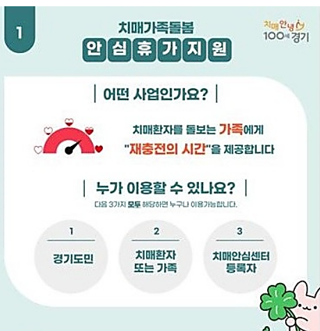 즉, 경기도에 거주하면서 관할 치매안심센터에 등록되어 있는 환자와 가족이면 누구나 신청 가능합니다.