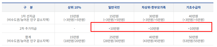 이번 2차 지급에서는 전국민 90%를 대상으로 1인당 10만 원이 추가 지급되며, 차상위 계층과 한부모 가족, 기초수급자에게도 +10만 원이 추가로 지급됩니다.