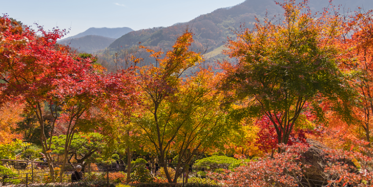 특히 가을에는 내장단풍, 당단풍, 털단풍, 노르웨이 단풍 등 400여 종의 단풍나무가 불타는 듯한 붉은색과 황금빛 노란색으로 물들며 가히 장관을 이룹니다. 단순히 한두 그루의 단풍이 아니라, 수천 그루가 어우러져 만들어내는 물결 같은 풍경은 사진으로 다 담기 어려울 정도로 압도적입니다.
