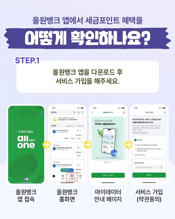 올원뱅크 앱에서 세금포인트를 확인하려면 NH마이데이터 서비스 가입이 필수입니다. 절차는 다음과 같습니다.