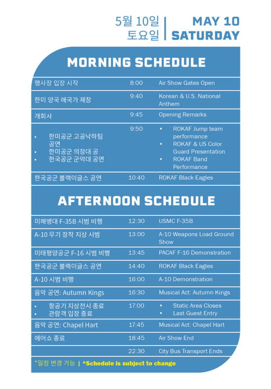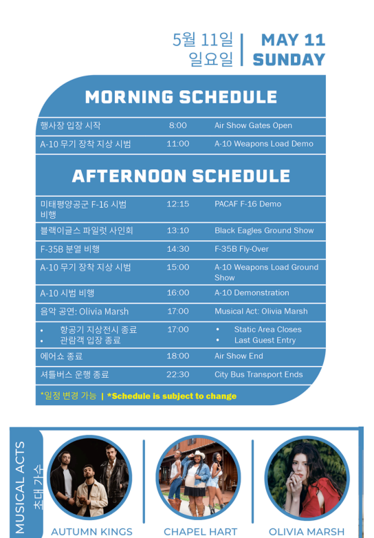 미 태평양 공군(FPACAF) 소속의 F-16 바이퍼 시범팀(Viper Demo Team)이 선보이는 고속 기동과 극한의 선회 비행은 항공 팬들의 가슴을 설레게 할 것입니다.
