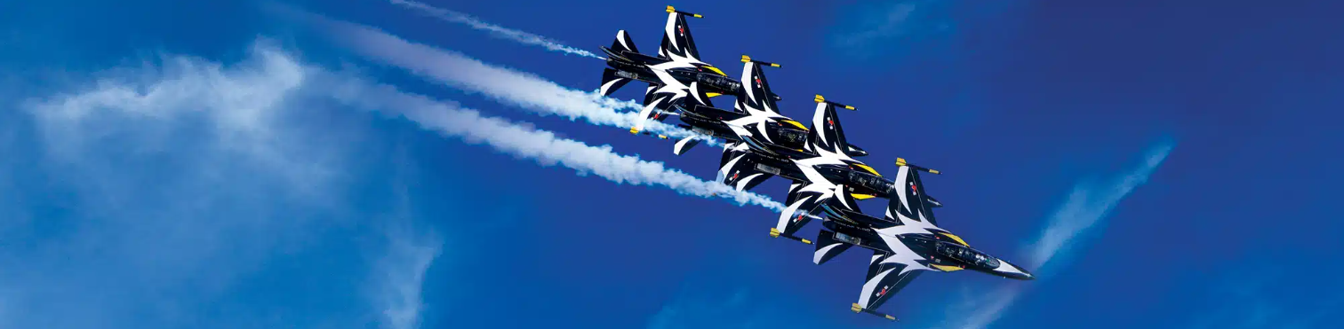 대한민국 공군 특수비행팀 블랙이글스(T-50B 편대)는 독창적인 에어로배틱을 통해 정교함과 스릴을 동시에 전하며, 대한민국 항공 기술의 자긍심을 보여줄 것입니다.