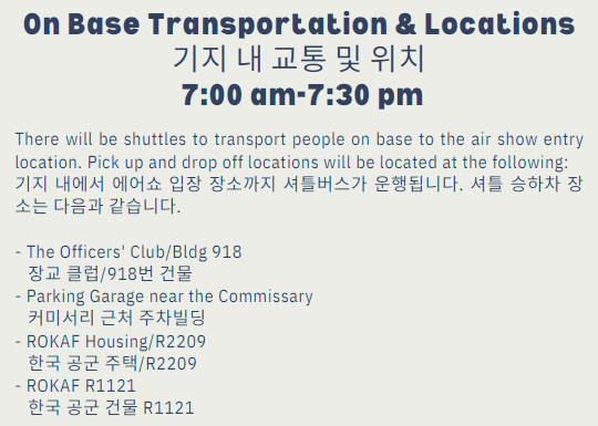 셔틀버스: 행사 기간 중 오산역 ↔ 오산 공군기지 간 무료 셔틀버스 운행 예정 (※ 운영 시간표는 추후 공식 발표 예정)