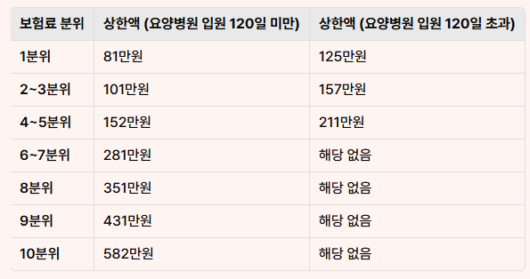 아래 표는 개인 연소득 수준(보험료 분위)에 따라 정해지는 상한액입니다.